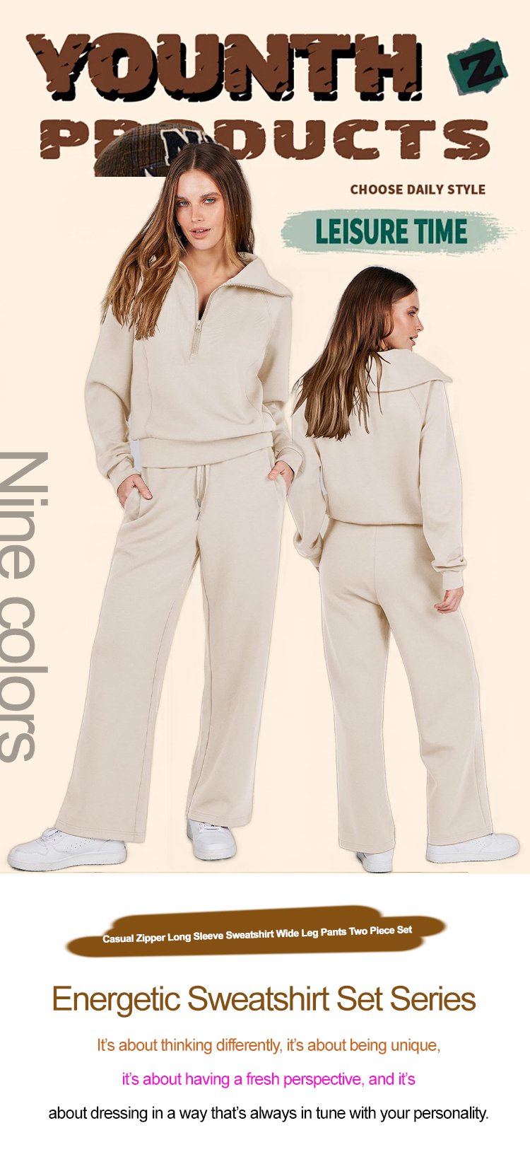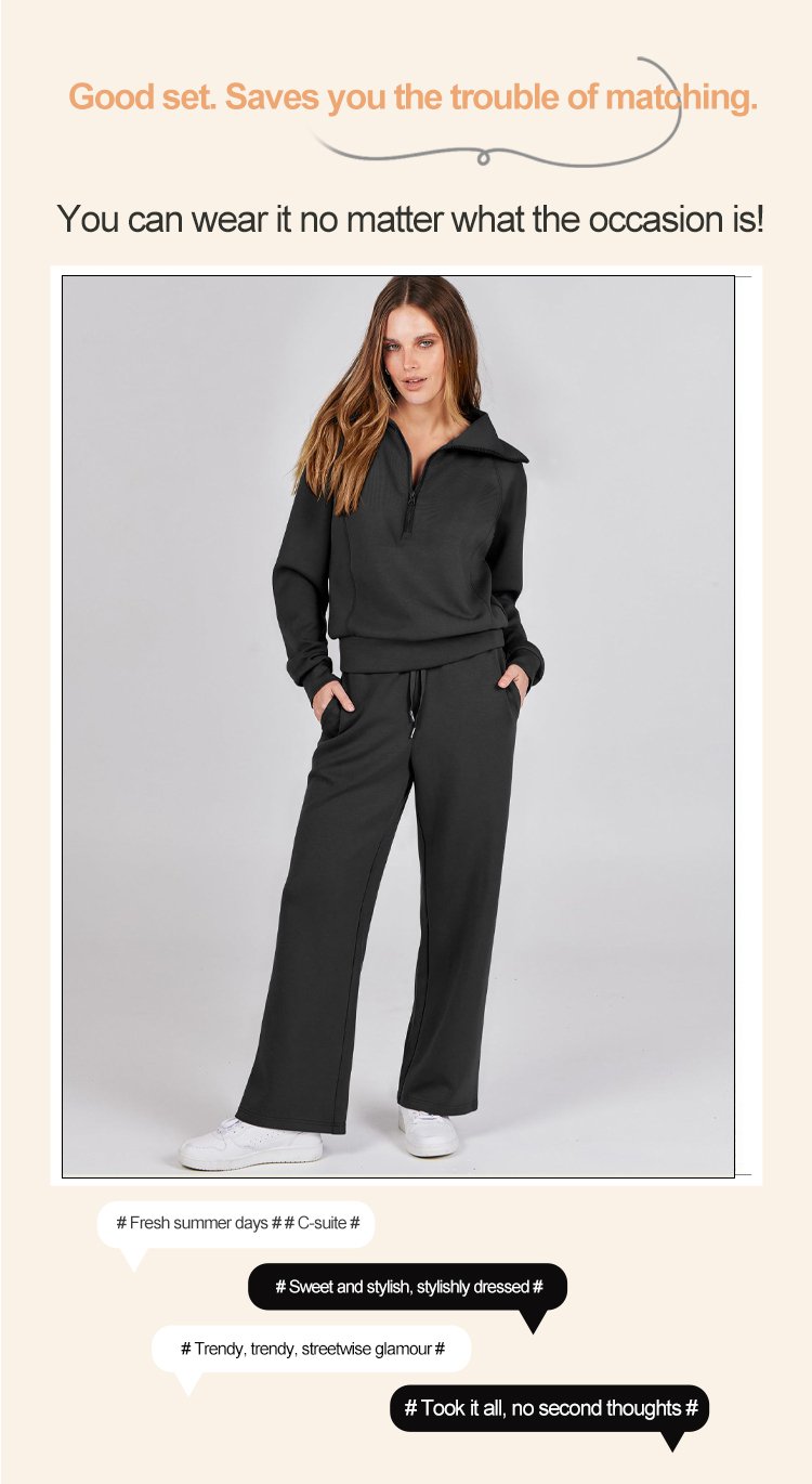 Casual Zipper Long Sleeve Hoodie and Wide Leg Pants Two-Piece Set